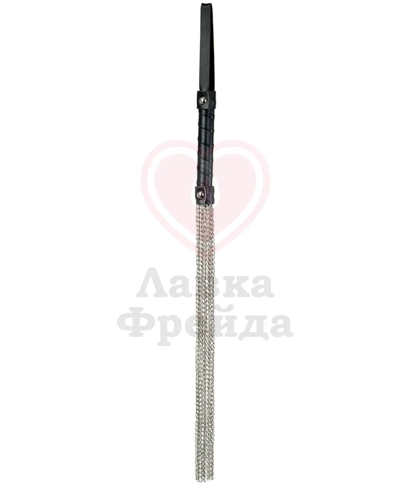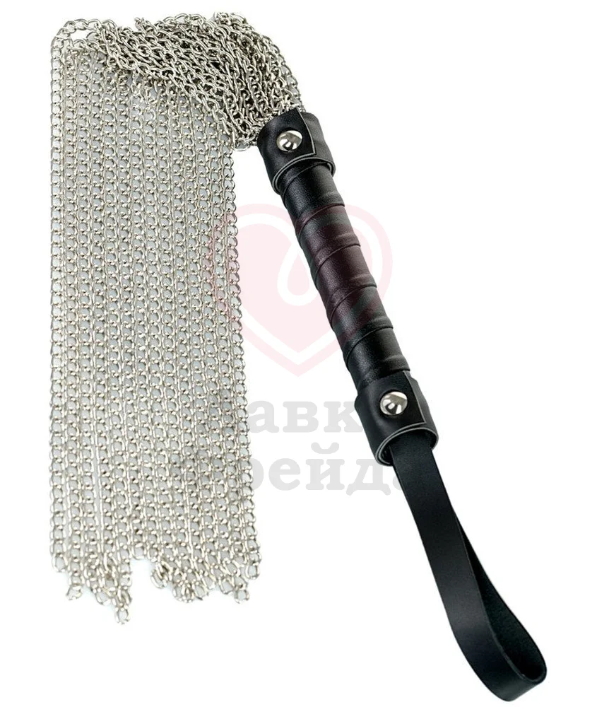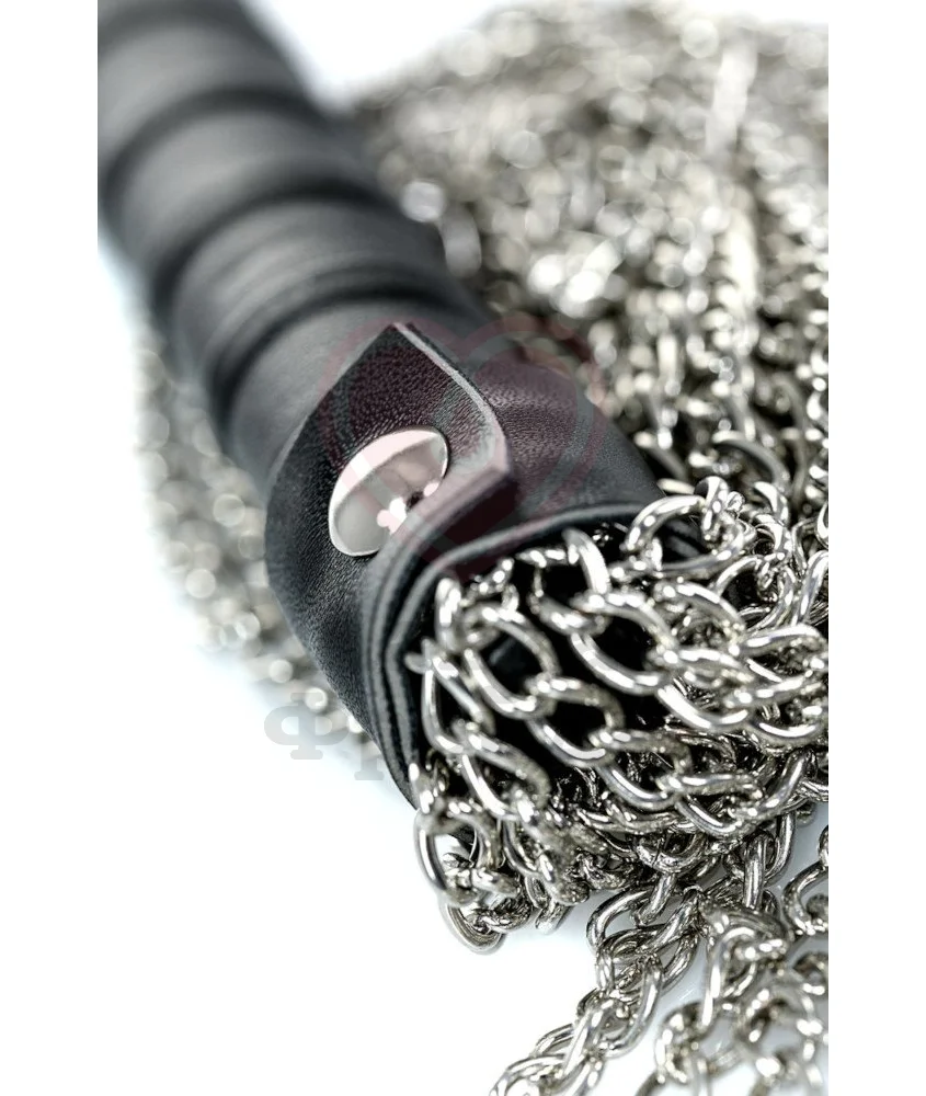 Ударная часть этого флоггера состоит из длинных металлических цепочек, которые обеспечат особенно сильное воздействие. Металл будет одновременно холодить и разогревать кожу, а также добавит приятных болевых ощущений в руках умелого мастера. Ручка плетки покрыта переработанной кожей для более комфортного расположения при использовании. Общая длина составляет 53, 5 см.