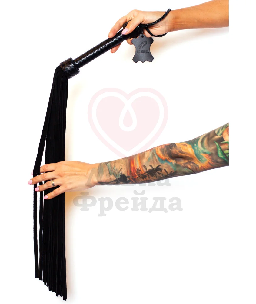 Прочная рукоятка флоггера Scandal изготовлена из натуральной кожи премиального качества, а длинный хвост - из нежной натуральной замши, порезанной на тонкие длинные ленты. Аксессуар позволит насладиться легкими БДСМ играми с доминированием и подчинением без малейшего вреда телу. Плетёная рукоятка флоггера дополнена удобной петлей-ручкой, которая обеспечивает надежную фиксацию плётки на запястье.