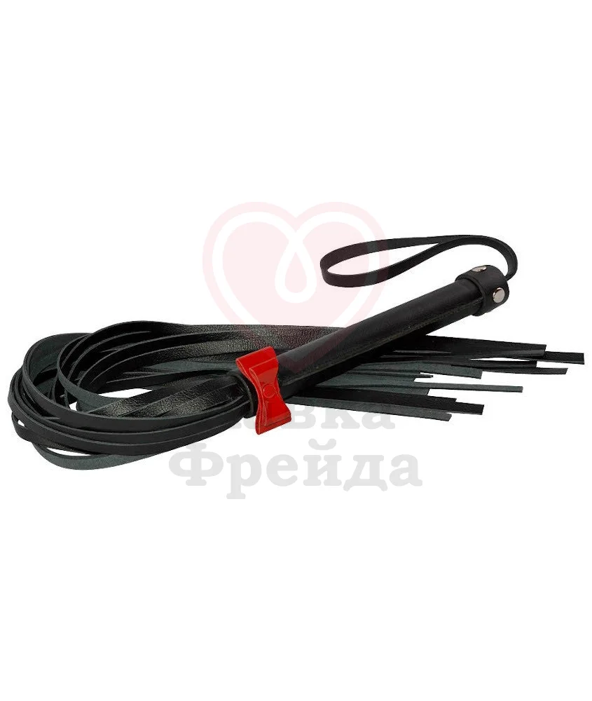 Плеть выполнена из натуральной чёрной кожи, ручка украшена небольшим лакированным бантиком красного цвета, который является небольшим, но ярким акцентом. На конце ручки расположен специальный ремешок, чтобы перевесить флоггер на запястье при необходимости. Общая длина девайса 55 см.