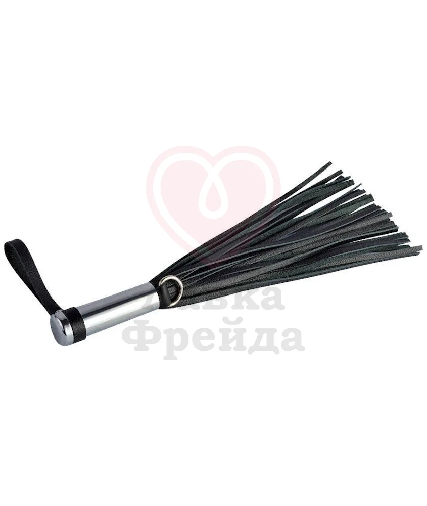 Совсем маленький флоггер общей длиной 23 см легко помещается в ладонь — держать его удобно за счёт металлической ручки. Ударная часть изготовлена из полосок натуральной кожи, как и небольшой ремешок на ручке, который подойдёт скорее для дополнительного закрепления на пальцах.