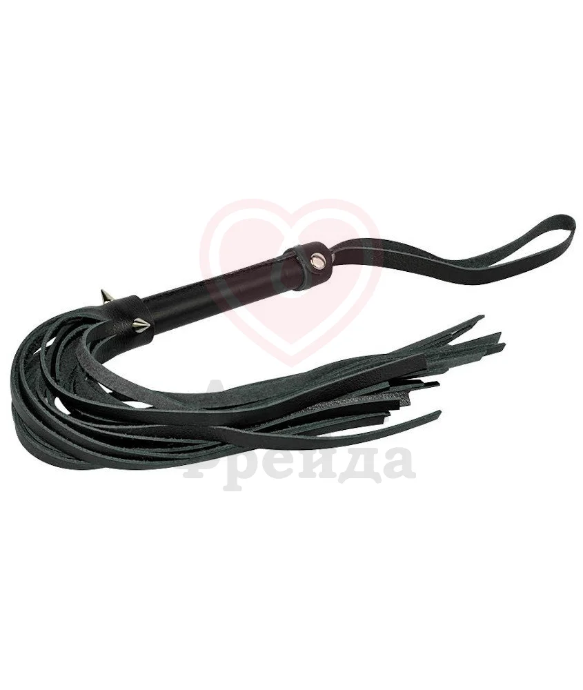 Плеть выполнена из натуральной чёрной кожи, ручка украшена небольшим металлическими шипами для более дерзкого вида. На конце ручки расположен специальный ремешок, чтобы перевесить флоггер на запястье при необходимости. Общая длина девайса 40 см.