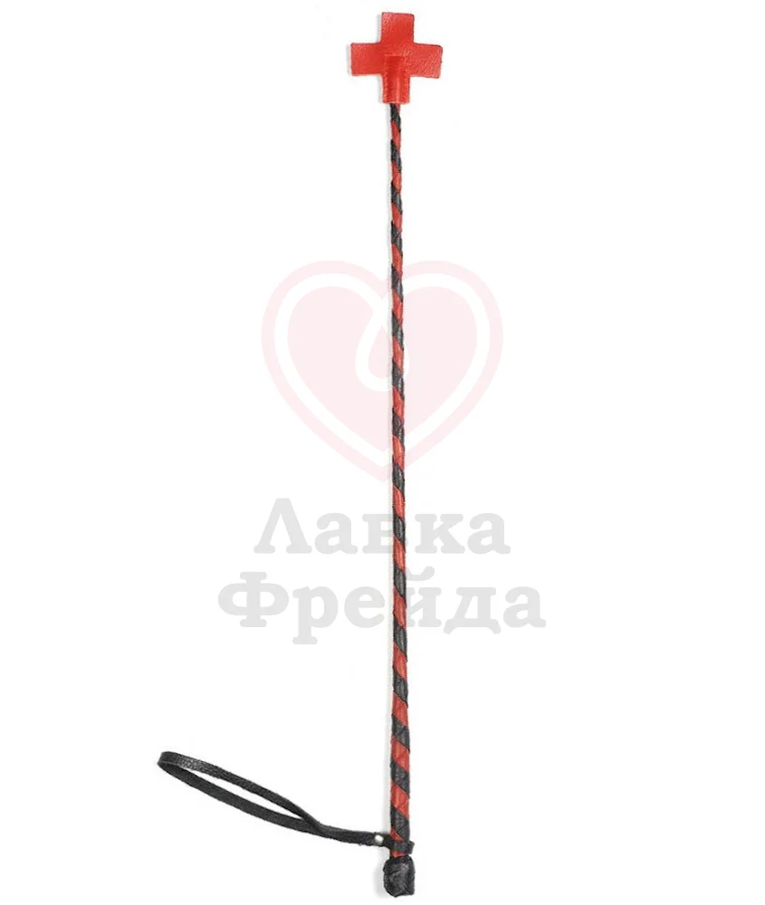 Стек состоит из гибкой сердцевины и оплётки из натуральной кожи черного и красного цветов, которая придаёт ручке рельефности. Наконечник выполнен в виде креста, а на ручке есть небольшой ремешок, чтобы удерживает девайс в руках или на запястье. Длина изделия около 60 см.