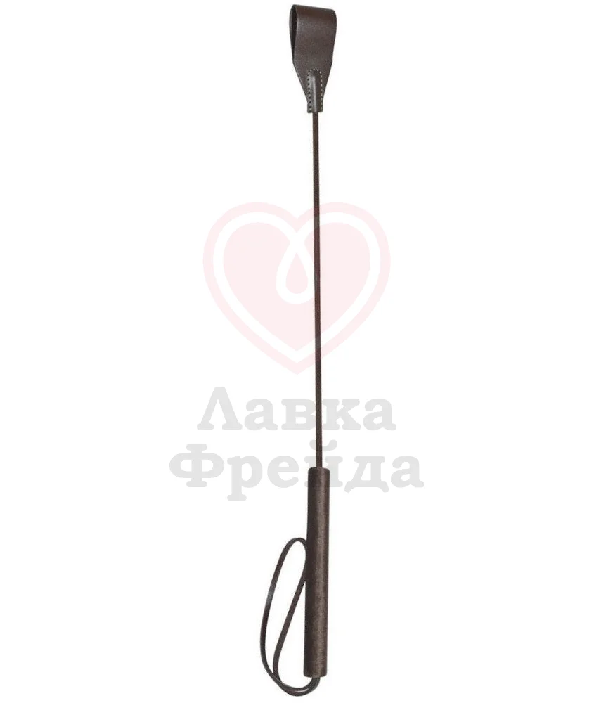 Кончик выполнен из натуральной кожи насыщенного цвета тёмного-шоколада, на ручке покрытие из велюровой ткани и ремешок-петля, позволяющий надевать стек на запястье.