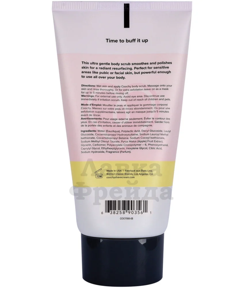 Скраб Coochy Ultra Smoothing Body Scrub нежно очищает кожу, избавляя ее от мертвых клеток эпидермиса, за счет чего кожа станет мягкой и сияющей. Средство предотвращает врастание волосков, появление раздражений и прочих микротравм. Натуральные ингредиенты из формулы средства, питают кожу, насыщают ее полезными элементами, а также увлажняют и ускоряют регенерацию. Чтобы использовать, кожу необходимо намочить, нанести скраб, мягкими движениями помассировать лицо и тело, а затем смыть. Для большего эффекта скраб можно оставить на лице и теле на 5 минут в качестве маски.