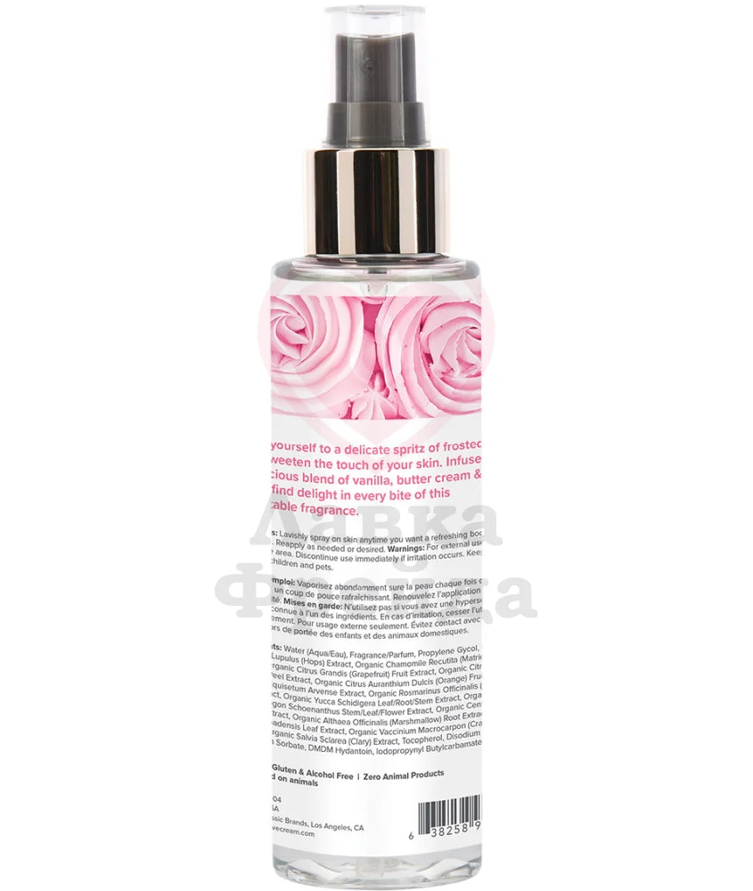 Легкий спрей Coochy Frosted Cake бережно ухаживает за кожей, обеспечивая ей сияющий и привлекательный внешний вид. Средство убирает раздражение и красные точки после бритья, не допускает врастания волосков, защищает от вредного УФ излучения, а также увлажняет и сужает поры. Консистенция достаточно нежная, чтобы использовать его на всех участках тела. Спрей нужно аккуратно распылять на тело или волосы - аромат свежеиспеченного торта со сливками окутает вас в кокон из тепла, уюта и нежной сладости.