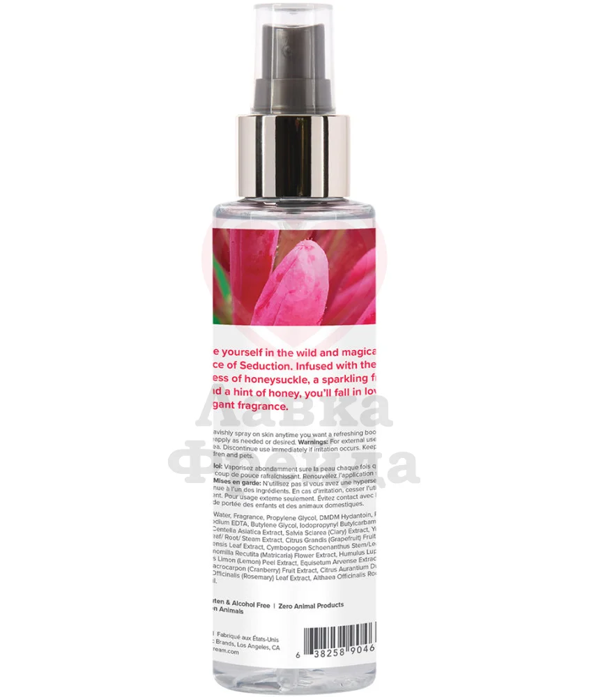 Легкий спрей Coochy Seduction бережно ухаживает за кожей, обеспечивая ей сияющий и привлекательный внешний вид. Средство убирает раздражение и красные точки после бритья, не допускает врастания волосков, защищает от вредного УФ излучения, а также увлажняет и сужает поры. Консистенция достаточно нежная, чтобы использовать его на всех участках тела. Спрей нужно аккуратно распылять на тело или волосы - солнечный аромат жимолости с игристыми фруктовыми оттенками и нотками меда окутает вас в кокон из тепла, уюта и нежной сладости.