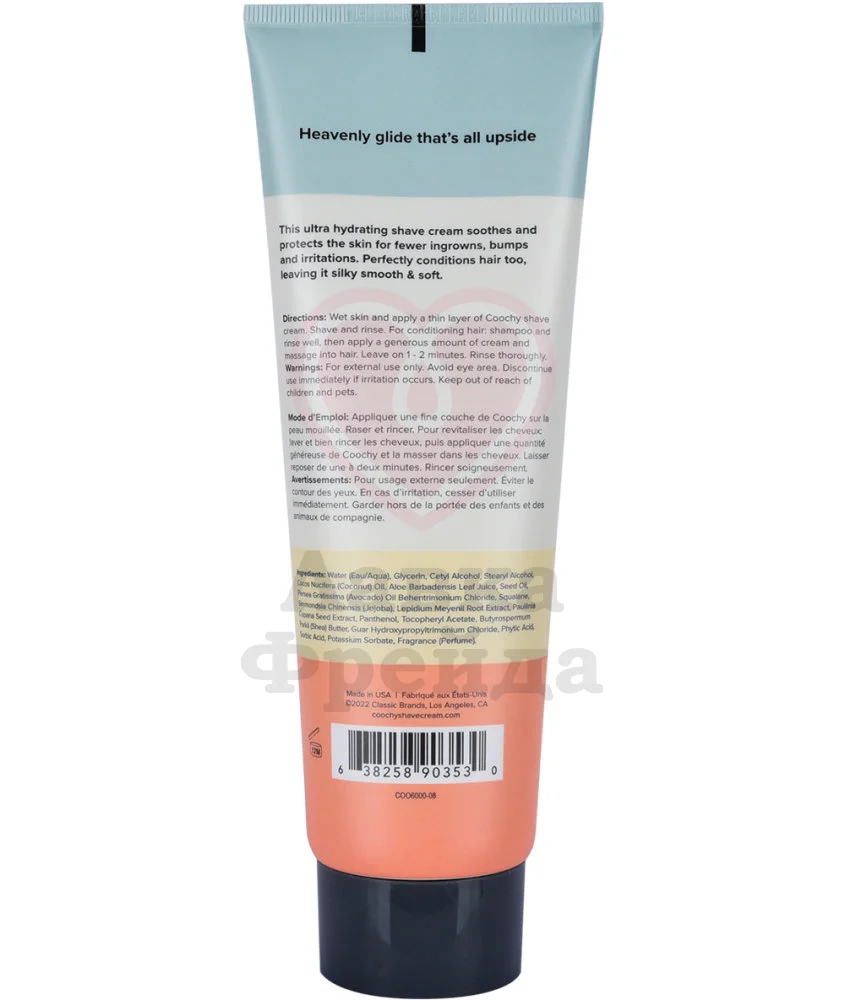 Coochy Ultra Hydrating Shave Cream - крем двойного назначения, который можно использовать в качестве средства для бритья, или как кондиционер для волос. Натуральные масла ши, кокоса, авокадо и прочие натуральные ингредиенты, нежно заботятся о волосах, питая их, увлажняя, делая мягкими и податливыми. Особенно хорошо такой кондиционер себя покажет на вьющихся и жестких волосах.