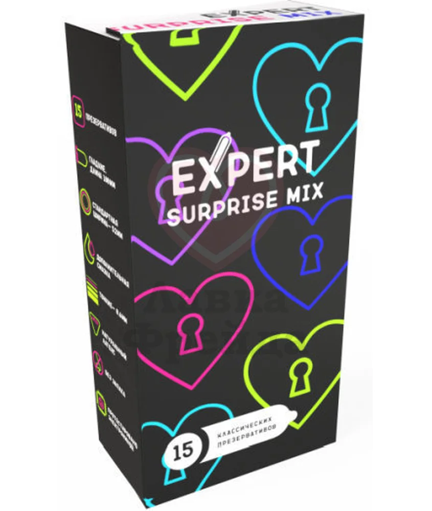 Комплект Expert Surprise Mix ― сюрприз бокс с 15 презервативами в индивидуальных упаковках. Набор содержит кондомы разного типа ― гладкие или рельефные, ароматизированные или без запаха, цветные или прозрачные, а может разогревающие или пролонгирующие. Изготовлены из качественного натурального латекса, толщиной 0,06 мм, что обеспечивает высокую чувствительность. Изделия прошли все необходимые проверки безопасности и качества с помощью электронной системы контроля, соответствуя международным стандартам. С ними вы будете чувствовать надёжность и уверенность в любой ситуации.
