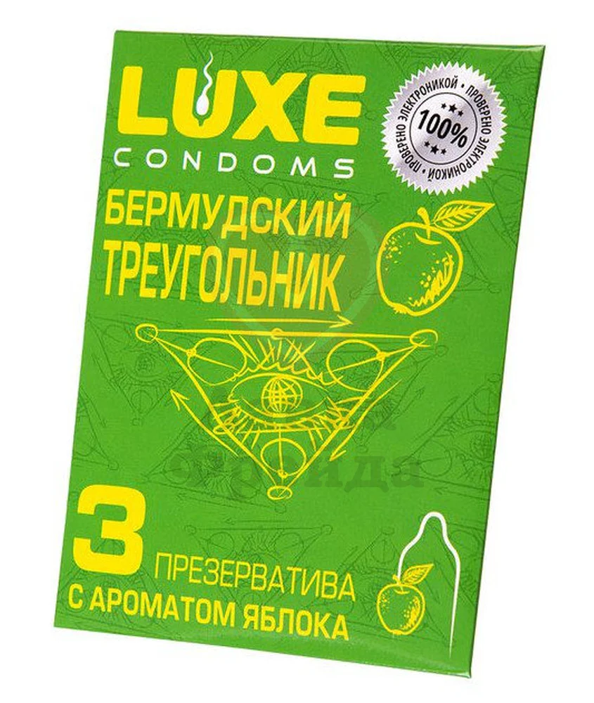 Презервативы Luxe Бермудский треугольник – это классическая форма, дополненная ароматом зеленого яблока, качественное решение для удовольствия и безопасного секса с партнером. Длина составляет 18 см, толщина стенок 0,06 мм. Презервативы изготовлены из латекса с силиконовой смазкой и протестированы при помощи электроники. В упаковке-конверте находится 3 презерватива с гладкой поверхностью. Ароматизированный вариант отлично подходит, чтобы разнообразить ваши впечатления от привычной близости, а также сделать её ещё приятнее.
