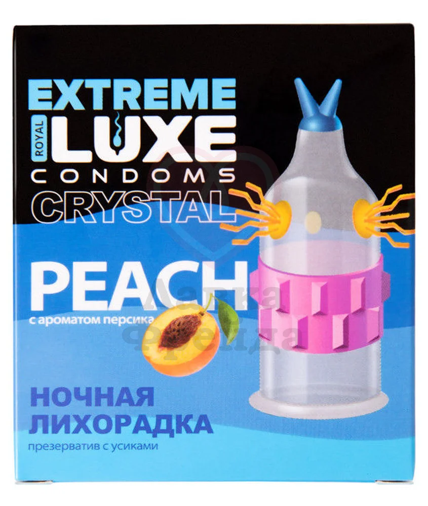 Презерватив Luxe Extreme Ночная Лихорадка с ароматом персика создан для безопасного секса, дополненного необычным ощущениями за счет рельефных вставок и усиков, расположенных ближе к кончику. Презерватив выполнен из натурального прозрачного латекса, имеет стандартную длину в 18 см и толщину стенок 0,06 мм.