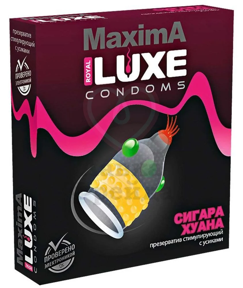 Необычный презерватив Luxe maxima Сигара Хуана доставит незабываемое удовольствие женщине, ведь в нем есть целых 3 дополнения. Пучок красных усиков на накопителе приятно стимулирует при глубоком проникновении, жёлтые шарики ласкают при каждом движении, а зелено-жёлтый ободок из нескольких рядов шариков и усиков создает волны мурашек по всему телу.
