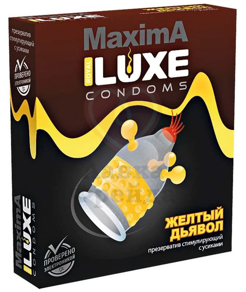 Необычный презерватив Luxe maxima Жёлтый дьявол доставит незабываемое удовольствие женщине, ведь в нем есть целых 3 дополнения. Пучок красных усиков на накопителе приятно стимулирует при глубоком проникновении, длинные жёлтые шарики ласкают при каждом движении, а жёлтый ободок мягких шариков создает волны мурашек по всему телу.
