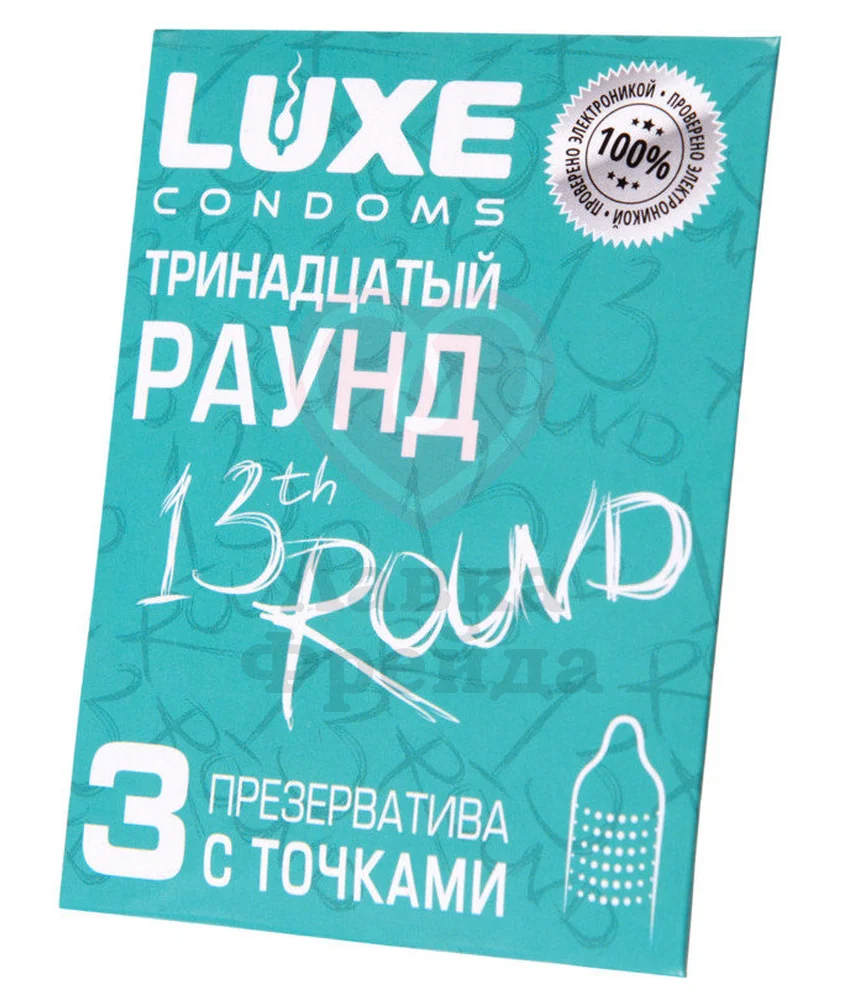 Рельефные презервативы Luxe Тринадцатый раунд – имеют особую поверхность, дополненную небольшими точками для стимуляции. Ощутите близость с партнером по-новому! Размер стандартный: длина 18 см, а толщина 0,06 мм. Презервативы изготовлены из натурального латекса с добавление силиконовой смазки. Проверены при помощи электроники, чтобы обеспечивать безопасность, а упакованы в яркую коробку-конверт. В комплекте 3 штуки.