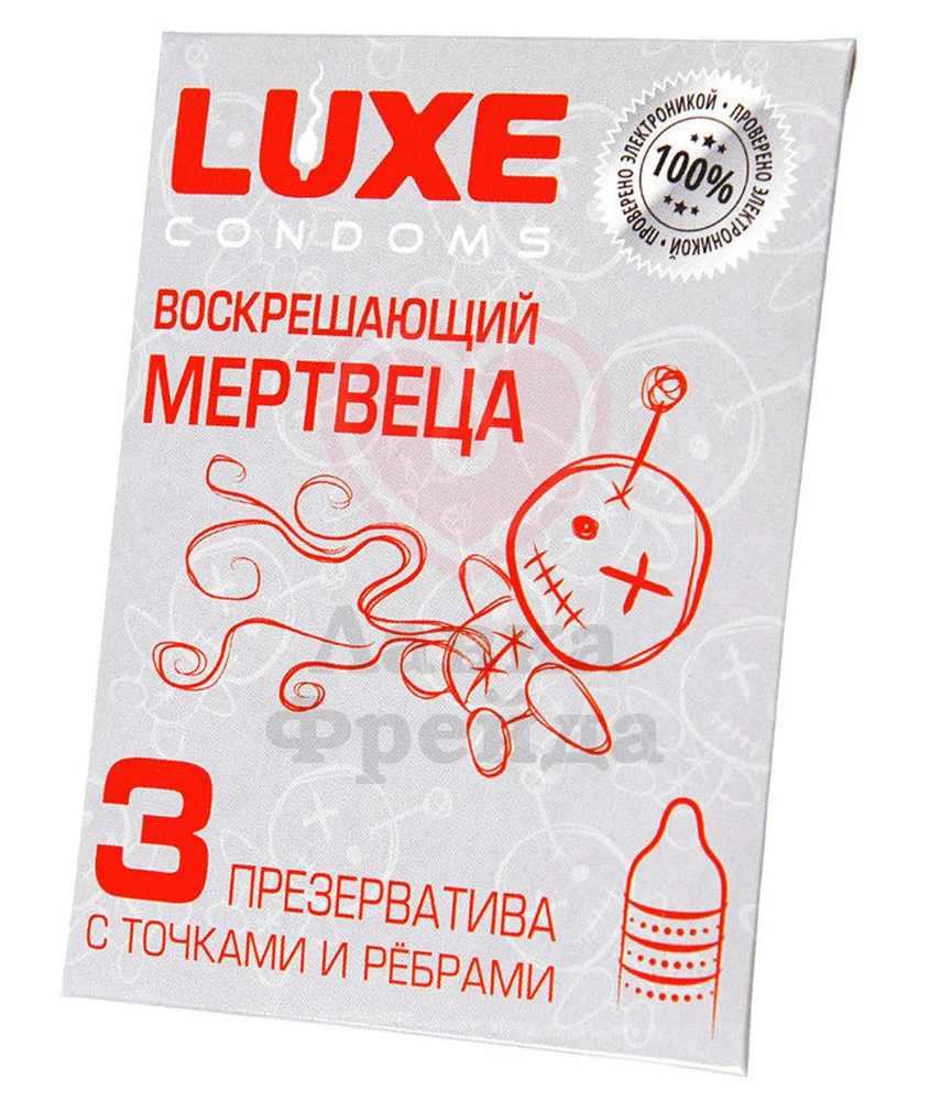 Рельефные презервативы Luxe Воскрешающий мертвеца – имеют особую поверхность, дополненную небольшими точками и ребрами для стимуляции. Ощутите близость с партнером по-новому! Размер стандартный: длина 18 см, а толщина 0,06 мм. Презервативы изготовлены из натурального латекса с добавление силиконовой смазки. Проверены при помощи электроники, чтобы обеспечивать безопасность, а упакованы в яркую коробку-конверт. В комплекте 3 штуки.