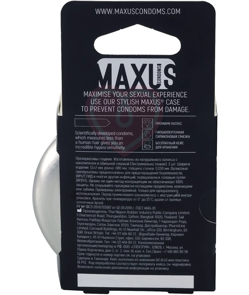 Maxus 003 - набор, состоящий из трех ультратонких презервативов, сделанных из качественного натурального латекса, и стильного кейсам, который защитит контрацептивы от повреждений и будет всегда под рукой. Maxus 003 имеют минимальную толщину латекса, что подарит более естественные и яркие ощущения от проникновения.