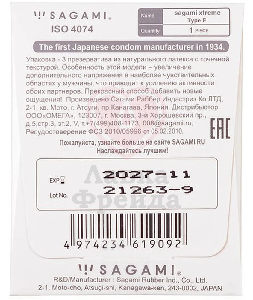 Японские рельефные презервативы Sagami Xtreme Type-E не только надежное средство контрацепции, но полная передача ощущений от секса обоим партнерам. Женщине обязательно понравится дополнительная стимуляция от пупырышек по всей поверхности, которая приблизит оргазм. Мужчина не будет лишен остроты ощущений благодаря уменьшенной толщине латекса.