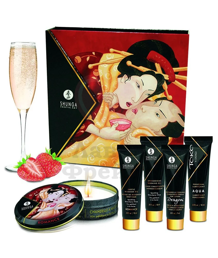 Набор косметики Geisha's Secret от компании Shunga станет великолепным подарком для яркого романтического вечера. В состав входят лучшие продукты марки - массажные масла, водный лубрикант и даже возбуждающий крем. Аромат клубники и шампанского настроит на получение удовольствия.