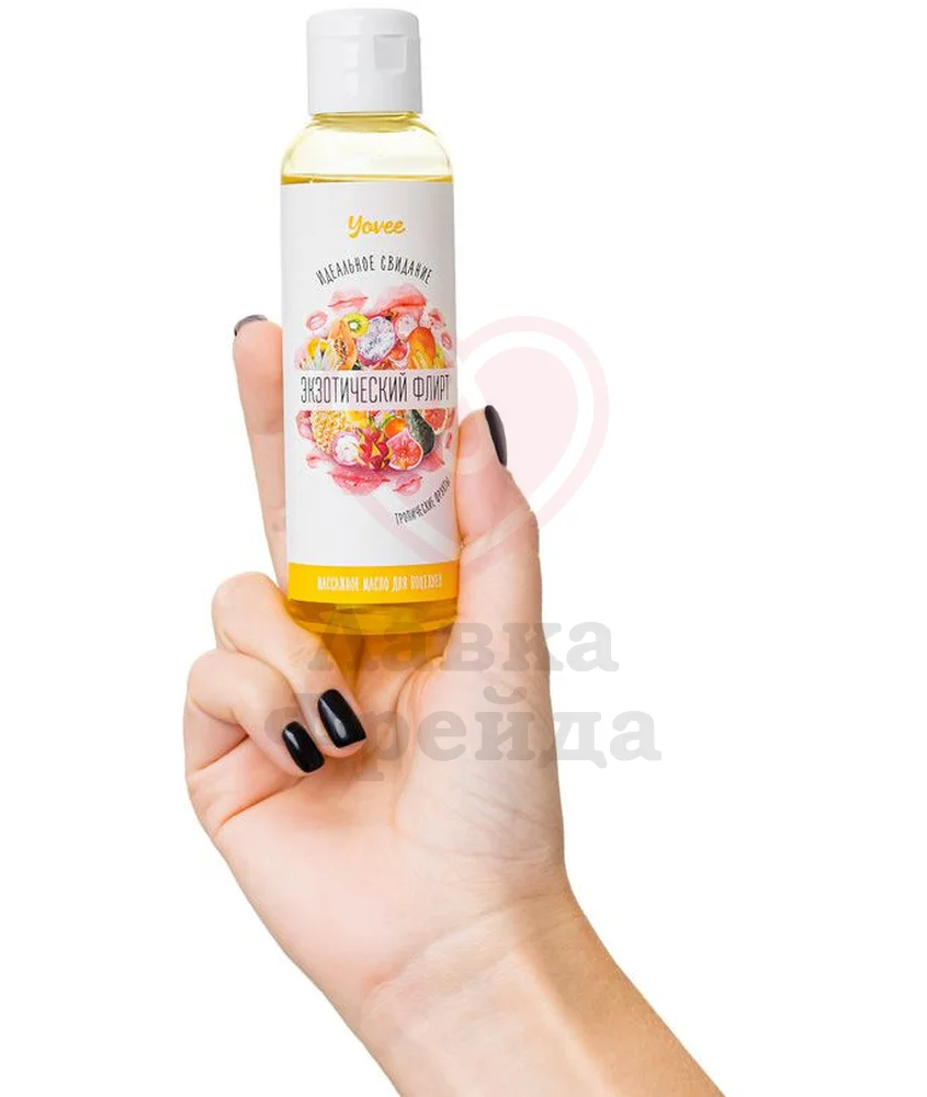 Массажное масло Экзотический флирт подходит не только для массажа, но и для поцелуев - средство необходимо тонким слоем нанести на кожу партнера, а затем нежными, чувственными движениями массировать его ладонями, или обнаженным телом, или сразу слизывать сладкую жидкость прямо с кожи, дразня и провоцируя каждым прикосновением и движением язычка. Чудесный вкус и запах тропических фруктов придется по вкусу обоим любовникам, а от тепла кожи аромат раскроется еще роскошнее. Обратите внимание, что масло является концентратом, поэтому его нельзя пить прямо из флакона. Нельзя использовать средство в качестве смазки для проникающего секса.