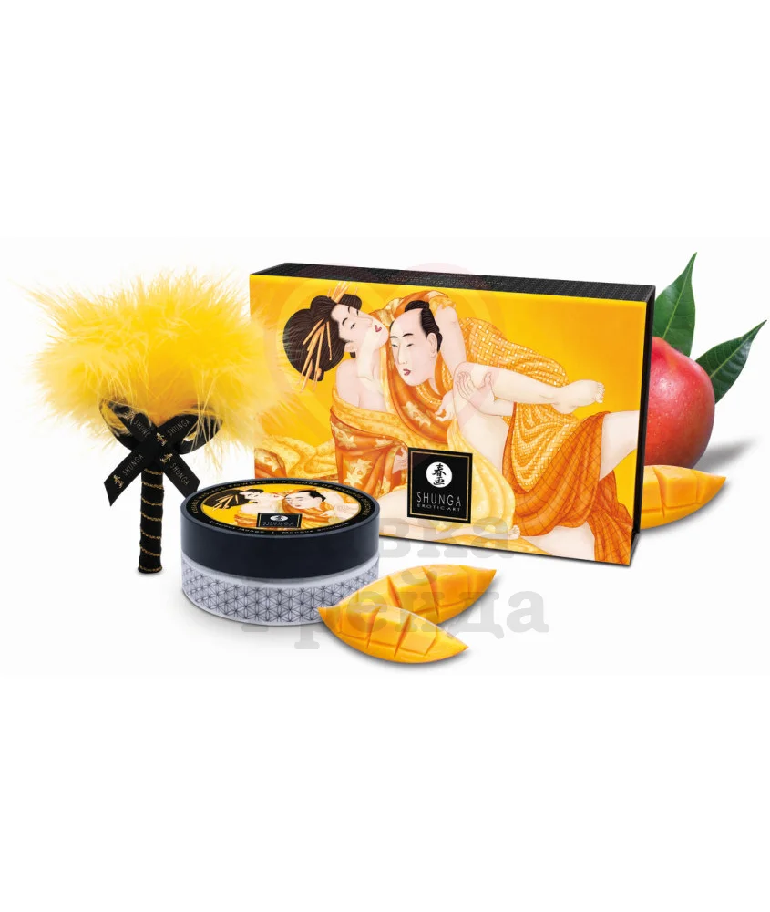 Набор Shunga Kissable Massage Powder Сочное Манго состоит из баночки с сухим массажным порошком и кисточкой, сделанной из пушистых перьев. Массажную пудру необходимо наносить на внешние эрогенные зоны на теле партнёра, а затем распределять нежными перьями по его коже, поддразнивая и возбуждая его каждым прикосновением. Порошок можно слизывать с кожи, пробуя партнёра на вкус. Сладкий аромат и вкус спелого манго добавит приятных ощущений в любовную игру. В составе порошка нет сахара, он хорошо подсушивает кожу, удаляя с неё лишнюю влагу, поэтому пудру можно наносить не только на партнера, но и посыпать им простыни, чтобы избежать неприятного ощущения сырости во время близости.