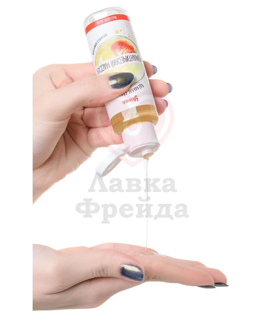 Масло Романтический массаж наполнит прелюдию атмосферой страсти, насыщенную ароматами клубники и шампанского. Масло необходимо налить в ладошки и чуть-чуть его растереть, а затем нанести на тело партнера. Нежными массирующими движениями масло можно втирать в кожу ладонями или обнаженным телом, дразня и возбуждая каждым прикосновением. Натуральные масла в составе средства - миндальное и виноградной косточки, бережно ухаживают за кожей, увлажняя ее, насыщая полезными элементами, повышая её эластичность и упругость. Нельзя использовать в качестве смазки для проникающего секса.