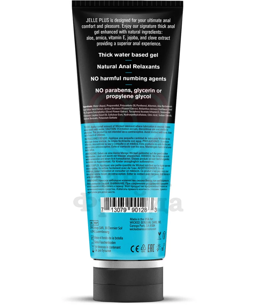 Формула лубриканта Jelle Plus обогащена натуральными релаксантами, растительными экстрактами и маслами, комбинация которых эффективно расслабляет и успокаивает нервные окончания ануса, подготавливая их к анальному сексу, а также питают кожу и ускоряют заживление микротравм. Формула на водной основе безопасна для презервативов и секс-игрушек, сделанных из любых материалов. Не имеет цвета, вкуса или запаха.