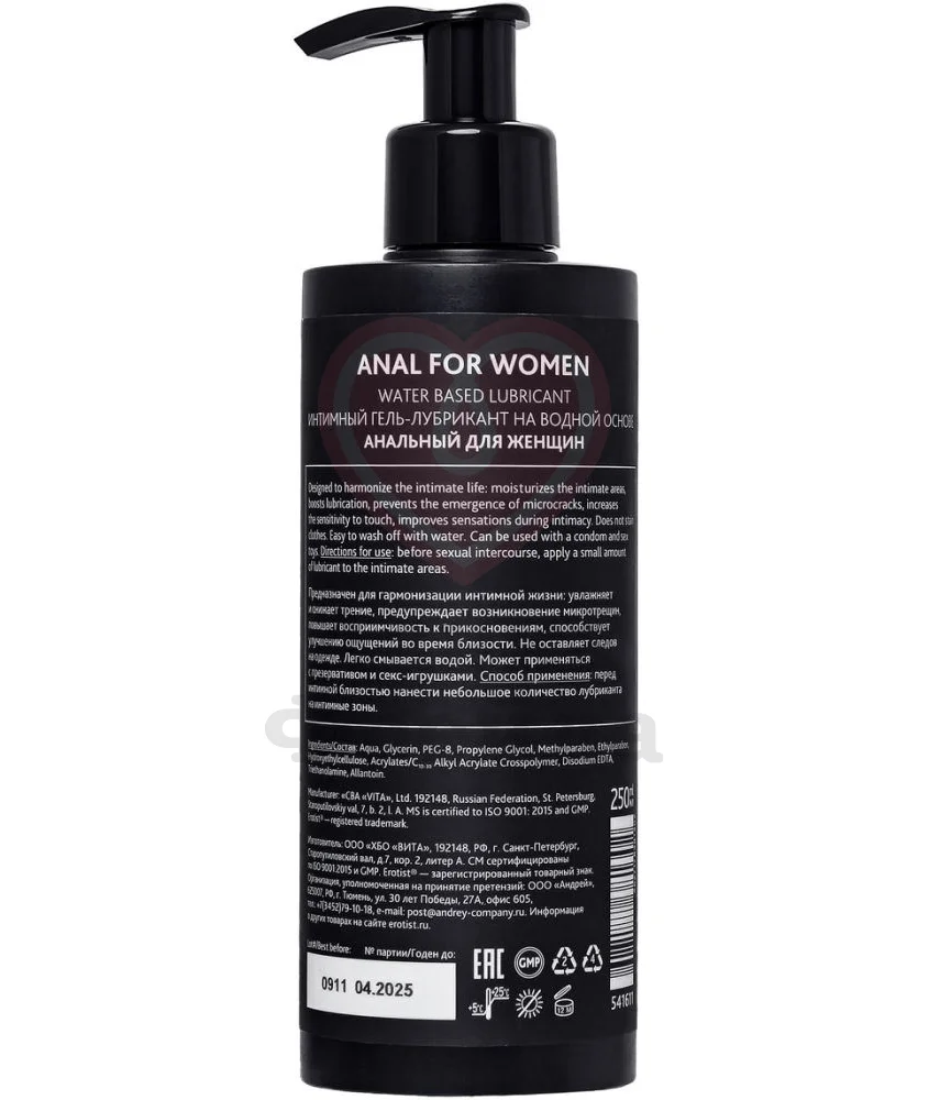 Erotist Anal For Women - особо густая смазка на водной основе, разработанная для безопасных занятий анальным сексом. Упакована в прочный флакон объёмом 250 мл, дополненный удобным дозатором. Вязкий лубрикант эффективно расслабляет мышцы, убирая болезненные ощущения и обеспечивая долгое комфортное скольжение.
