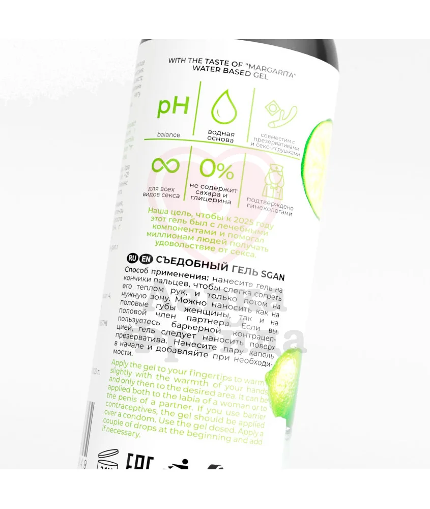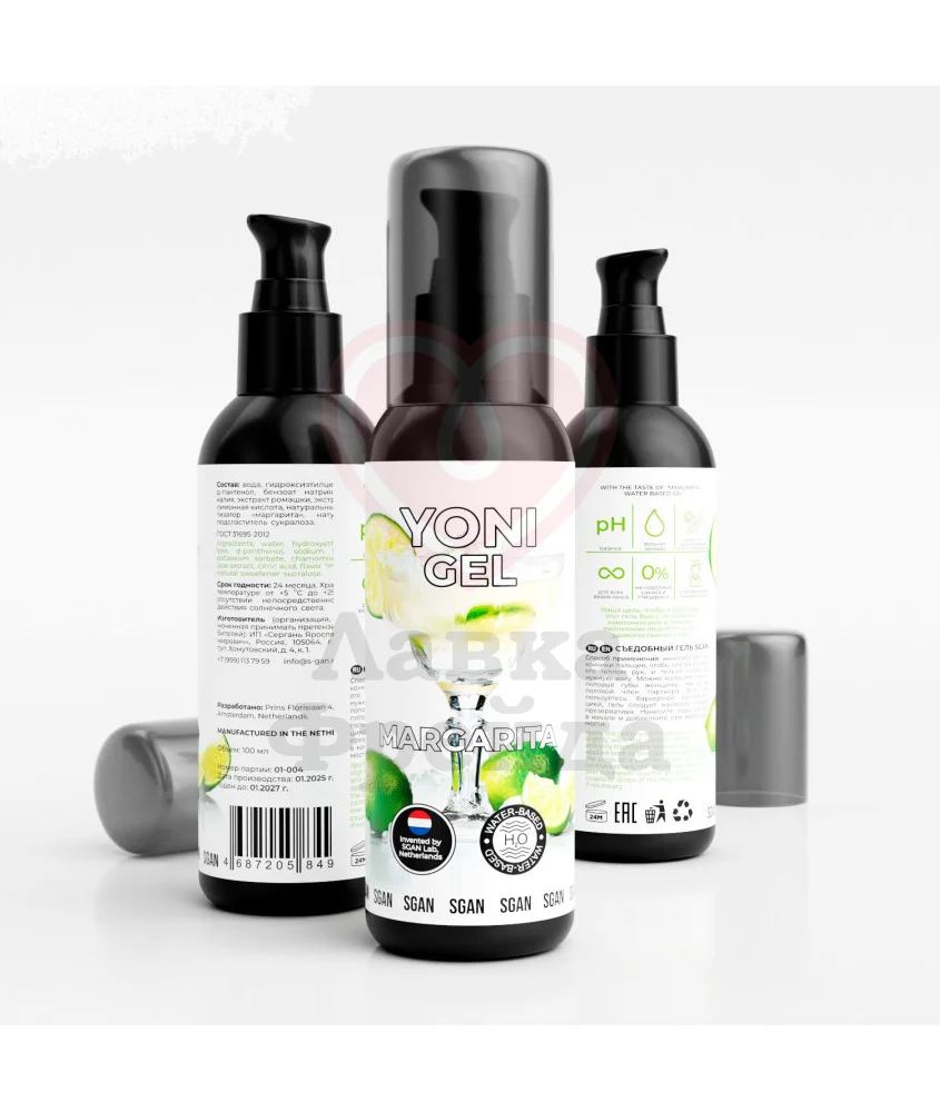 Лубрикант Sgan Yoni Gel разработан специально для орального секса, чтобы в процессе любовной игры вы одновременного могли дразнить партнёра каждым движением своего язычка и наслаждаться пьянящим вкусом коктейля Маргарита. Также гель можно использовать для классического проникающего секса. В составе находятся экстракты алоэ, ромашки, а также Д-Пантенол, комбинация которых деликатно увлажняет и питает кожу, заживляя мелкие воспаления и отёки. Сохраняет естественный pH слизистых. Можно комбинировать с презервативами и игрушками, сделанными из любых материалов.