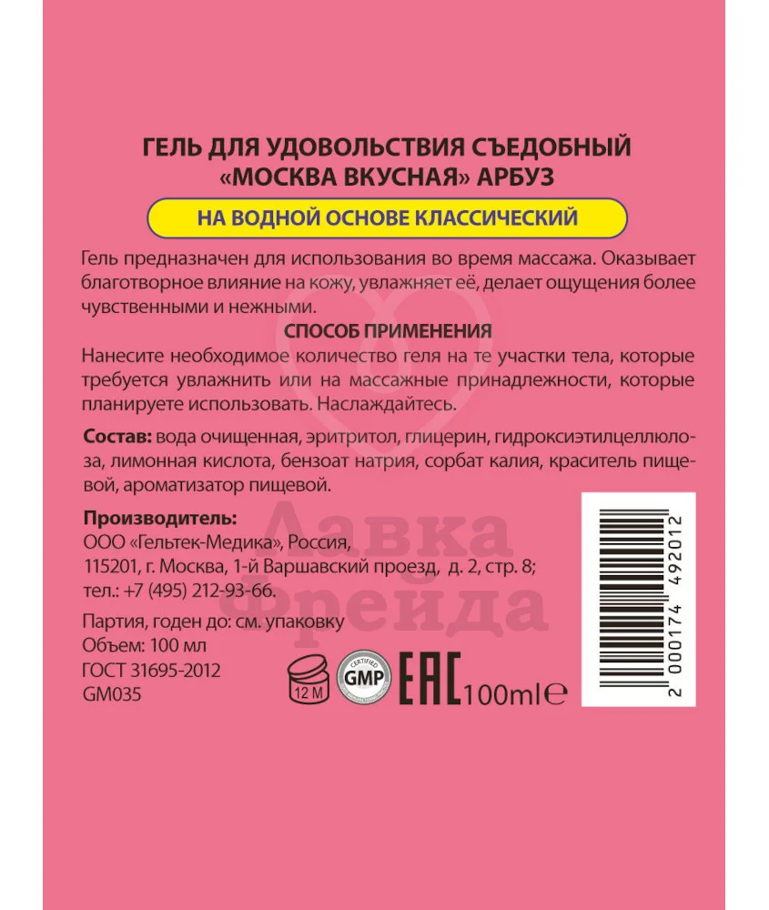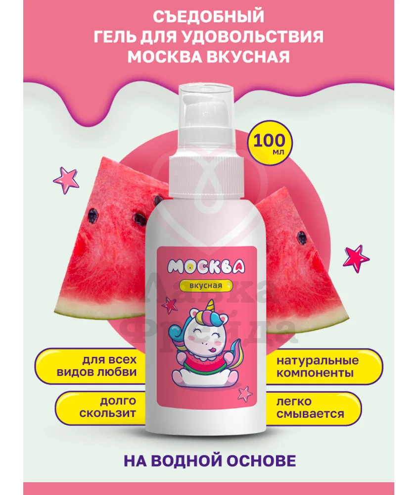 Лубрикант Москва Вкусная — это универсальная смазка на водной основе, которая лучше всего подойдет для орального секса. Этот вариант обладает насыщенным вкусом и ароматом арбуза — в составе нет сахара, но приятная сладость вам обеспечена! Все прикосновения будут еще более нежными, а скольжение — более плавным и гладким.
