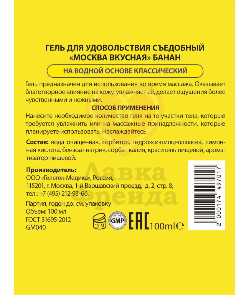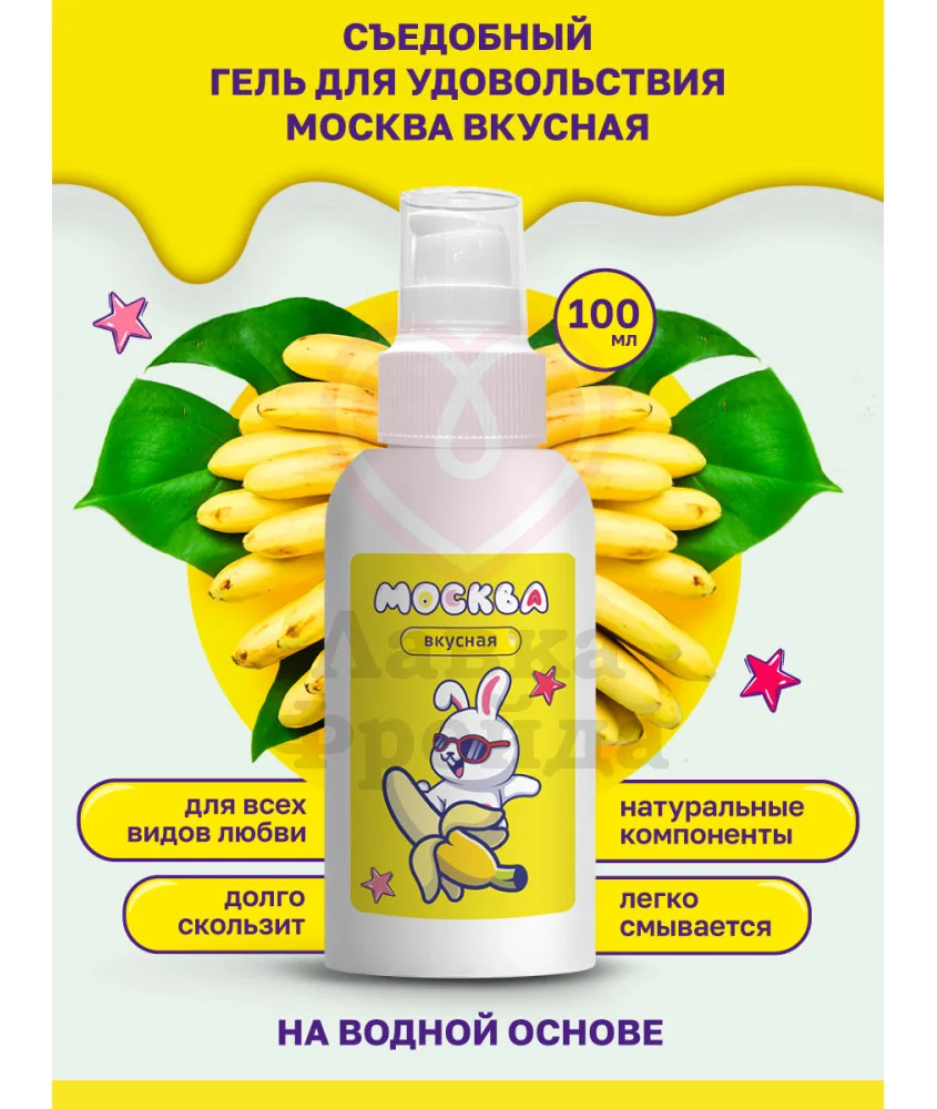 Лубрикант Москва Вкусная — это универсальная смазка на водной основе, которая лучше всего подойдет для орального секса. Этот вариант обладает насыщенным вкусом и ароматом банана — в составе нет сахара, но приятная сладость вам обеспечена! Все прикосновения будут еще более нежными, а скольжение — более плавным и гладким.