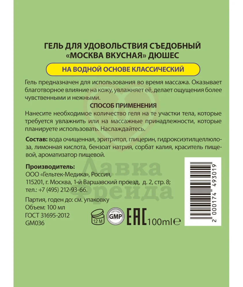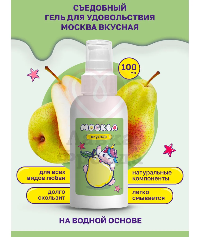 Лубрикант Москва Вкусная — это универсальная смазка на водной основе, которая лучше всего подойдет для орального секса. Этот вариант обладает насыщенным вкусом и ароматом лимонада или груши «Дюшес» — в составе нет сахара, но приятная сладость вам обеспечена! Все прикосновения будут еще более нежными, а скольжение — более плавным и гладким.