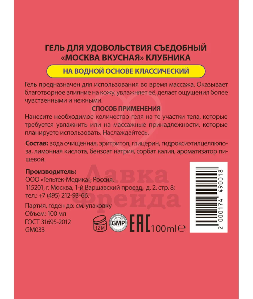 Лубрикант Москва Вкусная — это универсальная смазка на водной основе, которая лучше всего подойдет для орального секса. Этот вариант обладает насыщенным вкусом и ароматом клубники — в составе нет сахара, но приятная сладость вам обеспечена! Все прикосновения будут еще более нежными, а скольжение — более плавным и гладким.