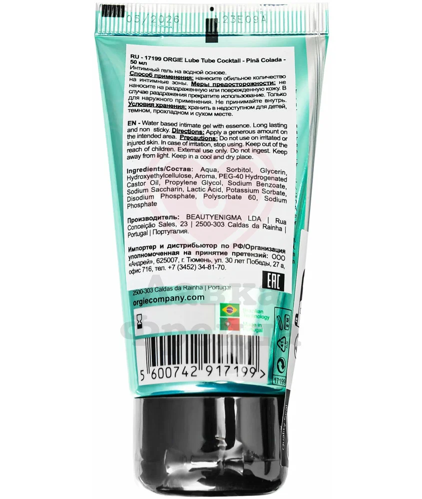 Orgie Lube Tube Cocktail - съедобная смазка на водной основе, совместимая с любыми презервативами и игрушками. Гель-лубрикант имеет яркий и насыщенный вкус и запах пина колады - дерзкая смесь крепкого рома, сока спелого ананаса и сливок из кокосового молока. Смазка наносится на член, клитор и область половых губ нежными, массирующими движениями. Легко смывается с тела и постельного белья. Лубрикант упакован в тубу объемом 50 мл.