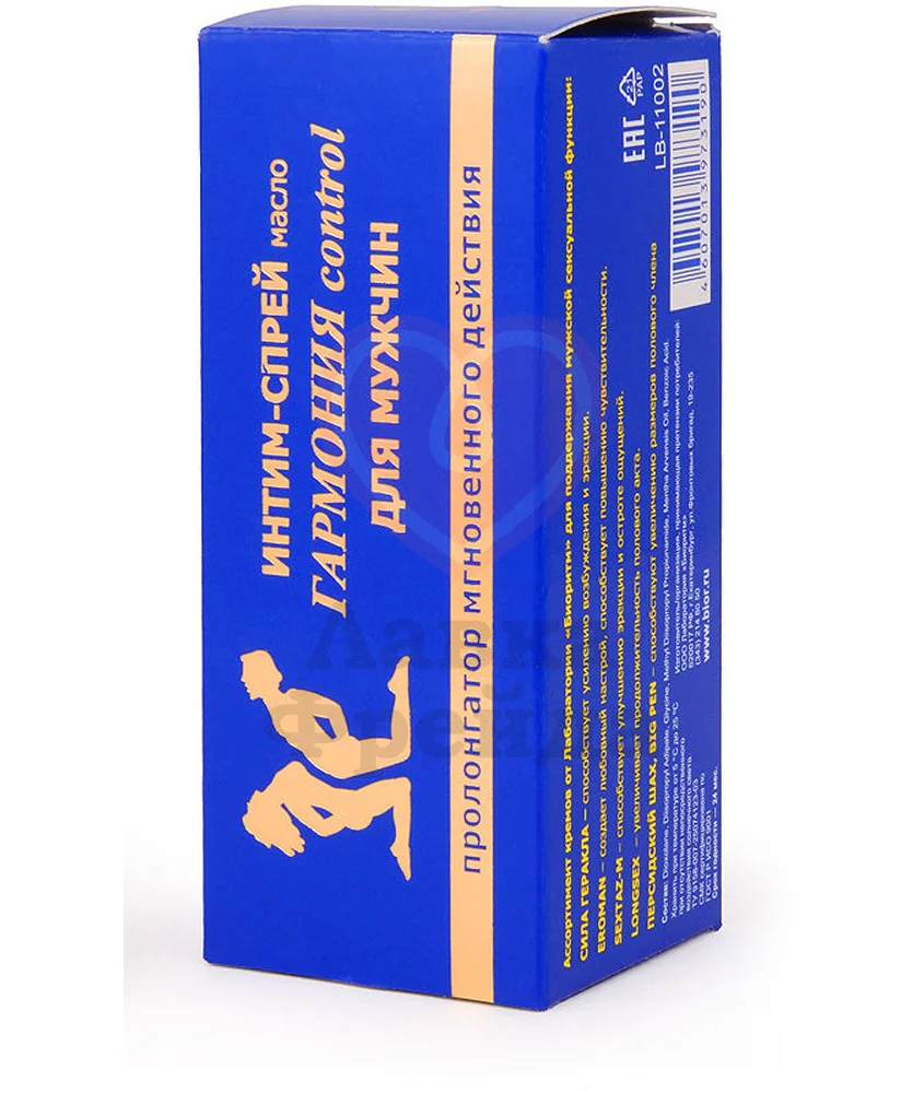 Спрей Bioritm Гармония Control для мужчин обладает отличным пролонгирующим действием. Натуральное масло мяты, входящее в состав, обеспечивает эффективное продление полового акта и одновременный уход за кожей пениса. Средство удобно в использовании: достаточно нанести 1-2 пшика на пенис мужчины, и уже через несколько минут вы почувствуете его действие. Прекрасно сочетается с любыми презервативами.