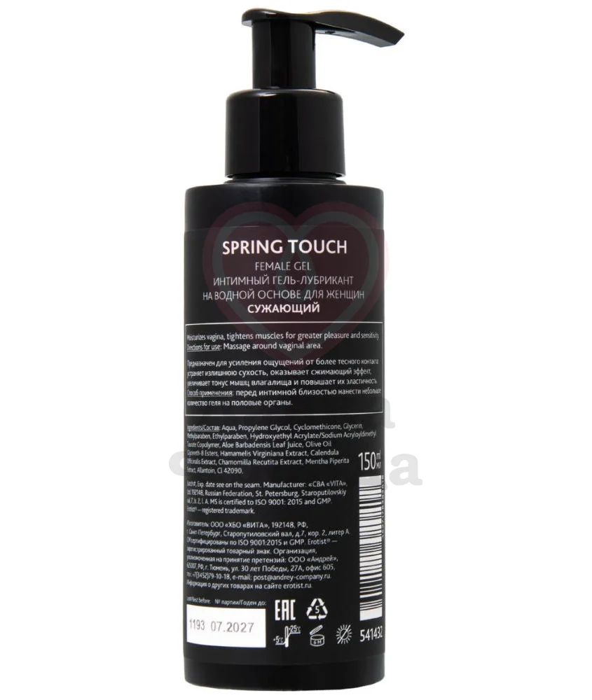 Формула женского геля Erotist Spring Touch содержит в себе экстракты алоэ вера, календулы, ромашки, а также оливковое масло, комбинация которых обеспечивает лёгкое противовоспалительное действие, защищая нежные слизистые от микротравм. Упаковка - пластиковый флакон объёмом 150 мл, дополненный удобным дозатором.