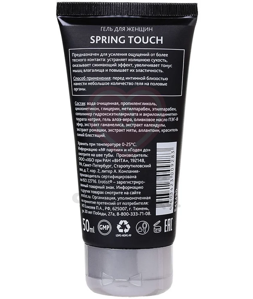 Вагинальный гель Erotist Spring Touch обладает мягким сужающим эффектом, что повышает чувствительность интимных зон и обостряет ощущения для обоих партнёров. Активные компоненты дарят длительное комфортное скольжение, а также подчёркивают естественный аромат тела. Формула на водной основе совместима с любыми презервативами и секс‑игрушками, не нарушает естественный pH и не провоцирует раздражение.