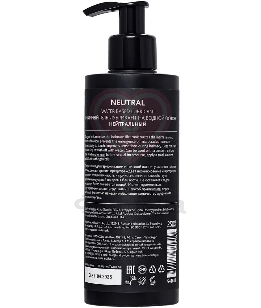 Нейтральный лубрикант Erotist Neutral имеет в составе экстракт ромашки, обладающий лёгким антисептическим эффектом, за счёт чего гель деликатно ухаживает за самой нежной кожей, предотвращая появление микротравм. Смазка на водной основе совместима с презервативами и игрушками, сделанными из любых материалов. Объём флакона - 250 мл.