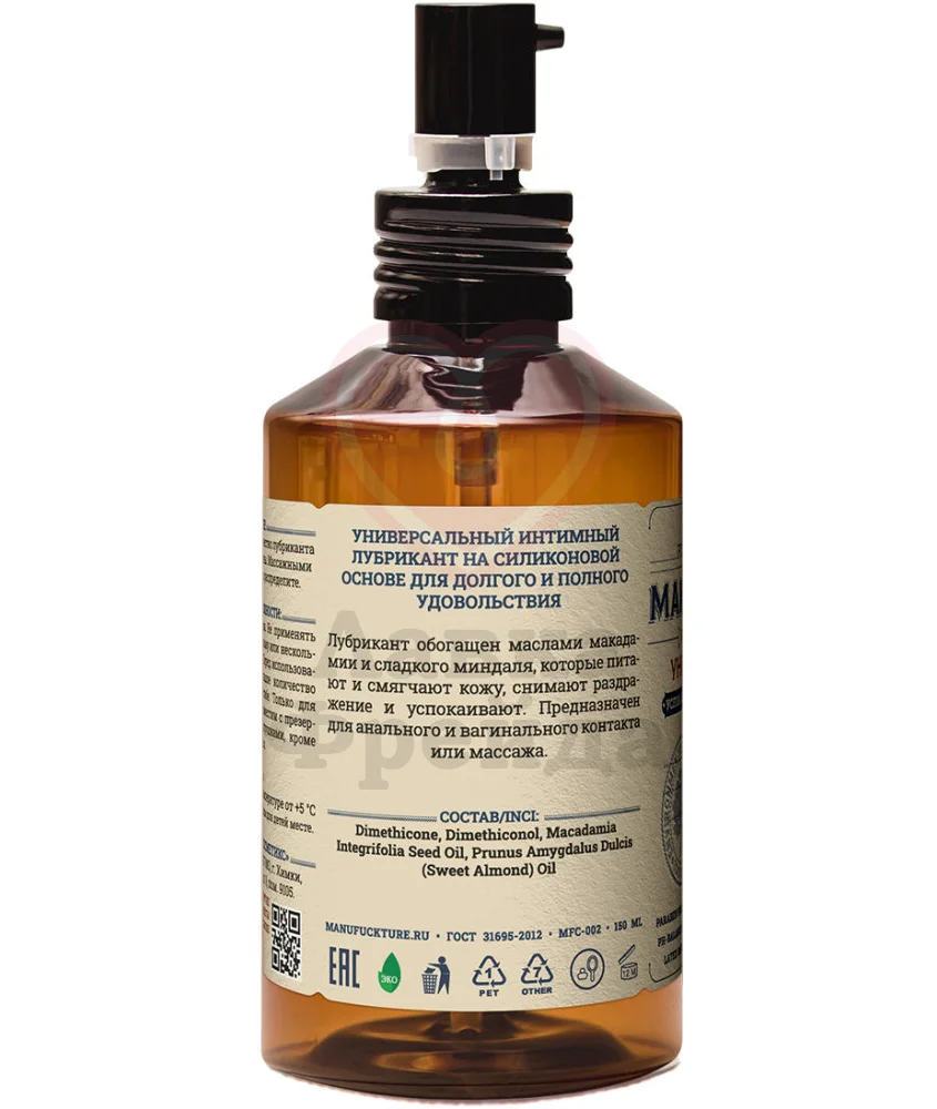 Лубрикант Manufuckture идёт на силиконовой основе, что гарантирует длительное скольжение даже при вагинальной сухости. Можно использовать для вагинального или анального проникновения. В составе средства находятся натуральные масла макадамии и сладкого миндаля, комбинация которых эффективно питает и увлажняет кожу, успокаивает её и насыщает полезными микроэлементами. Лубрикант можно применять в качестве массажного масла - для этого достаточно пары капель средства. Совместим со всеми игрушками и презервативами, кроме тех, которые изготовлены из силикона. Перед использованием, нанесите лубрикант на локтевой сгиб, чтобы проверить нет ли у вас аллергической реакции на какой-либо из ингредиентов.