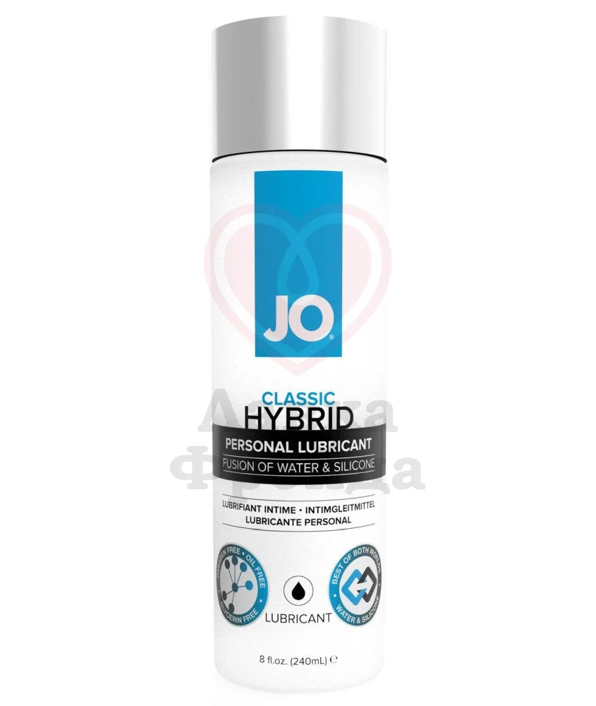 Лубрикант на водно-силиконовой основе JO Hybrid Lubricant сочетает в себе лучшие свойства этих двух видов. Силикон обеспечивает длительное шелковистое скольжение без ощущения липкости. За счет водной основы вы сможете использовать лубрикант с игрушками, легко смывать его водой даже без мыла, не оставляя следов на одежде или белье.