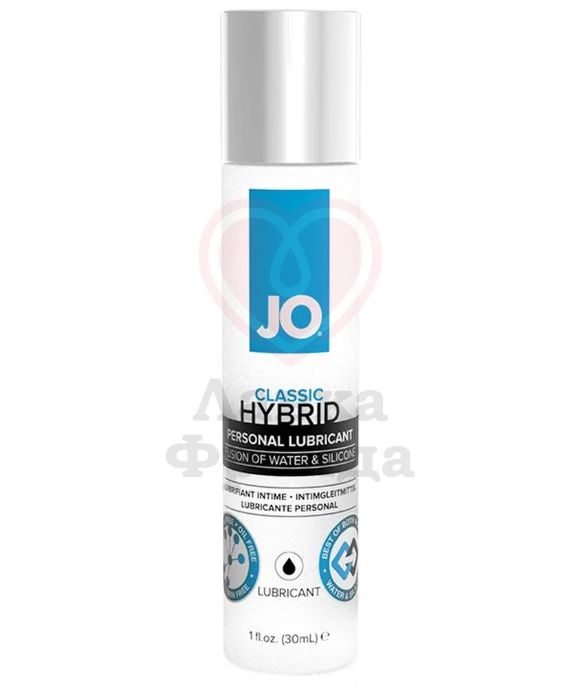 Лубрикант на водно-силиконовой основе JO Hybrid Lubricant сочетает в себе лучшие свойства этих двух видов. Силикон обеспечивает длительное шелковистое скольжение без ощущения липкости. За счет водной основы вы сможете использовать лубрикант с игрушками, легко смывать его водой даже без мыла, не оставляя следов на одежде или белье.