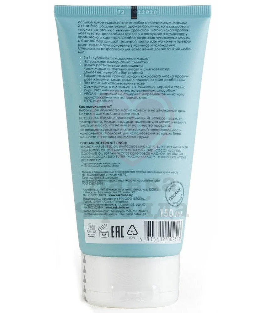 Аромат кокосового масла и какао настроит на нужный лад, пробуждая сексуальное желание. За счет особого сочетания натуральных масел получается нежная едва ощутимая текстура, которая тает на коже, создавая приятное скольжение. Специальная формула Ёska на масляной основе разработана для естественно долгих занятий любовью.