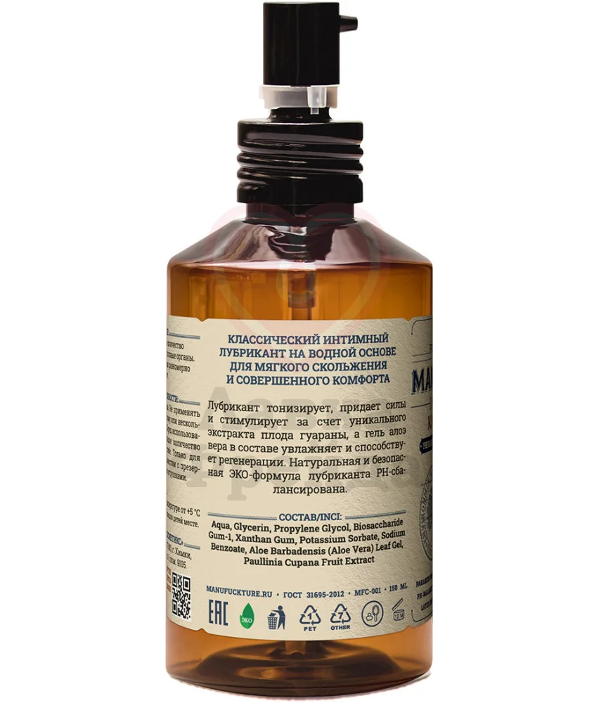 Лубрикант Manufuckture - классическая увлажняющая смазка, предназначенная для вагинального секса. В составе средства находятся натуральная вытяжка гуараны, которая, являясь природным афродизиаком и энергетиком, способна придавать силу и энергию во время близости. Также форме содержит экстракт алоэ, который увлажняет кожу, а также способствует ускоренному заживления микротравм. Лубрикант на водной основе совместим с любыми секс-игрушками и презервативами. Перед первым использованием, нанесите немного смазки на кожу локтевого сгиба, чтобы проверить нет ли у вас аллергической реакции на какой-либо из компонентов.