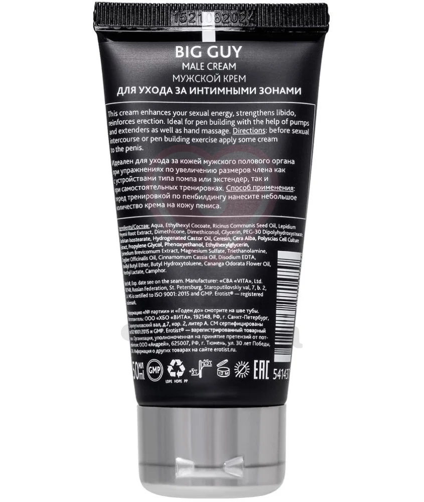 Крем Erotist Big Guy разработан для пенбилдинга - мануальная практика или тренировки с помпами, предназначенные для увеличения члена. В составе находятся масла корицы и иланг-иланга, экстракты горянки и перуанской маки - натуральные стимулирующие ингредиенты, которые способствуют большей эластичности кожи, ускоряют кровообращение в стволе, а также бережно ухаживают за деликатной областью.