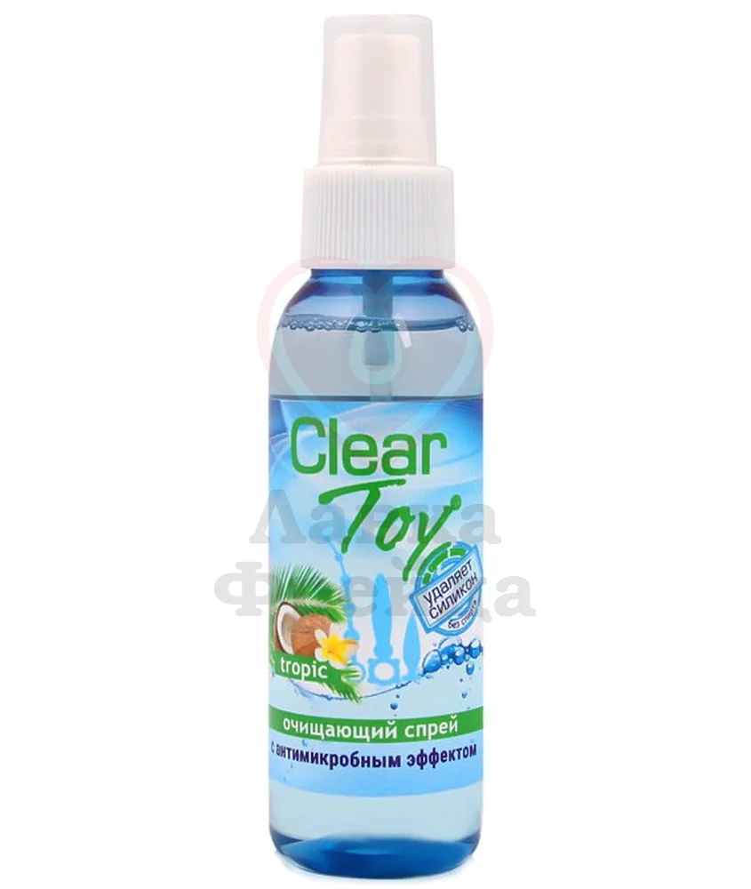Спрей обладает антибактериальным действием, очищая даже от силиконовых смазок, предотвращая появление посторонних запахов и придавая материалу игрушки приятный фруктовый аромат. Clear Toy Tropic подходит также и для тела, потому что не содержит спирта и не сушит кожу.