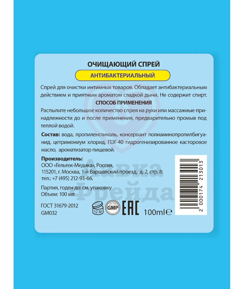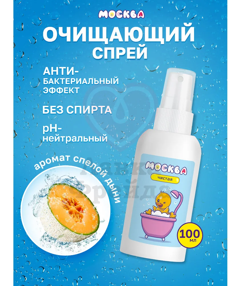 Очищающий спрей Москва Чистая обладает антибактериальным свойством и легким ароматом дыни, чтобы поддерживать ваши любимые секс-игрушки в идеальном состоянии. Средство имеет нейтральный Ph без спирта в составе, чтобы подходить для любых материалов и комфортно ощущаться при контакте с кожей. Спрей предотвращает появление неприятных запахов и поможет вам удалить загрязнения с поверхности игрушек как до, так и после их использования.