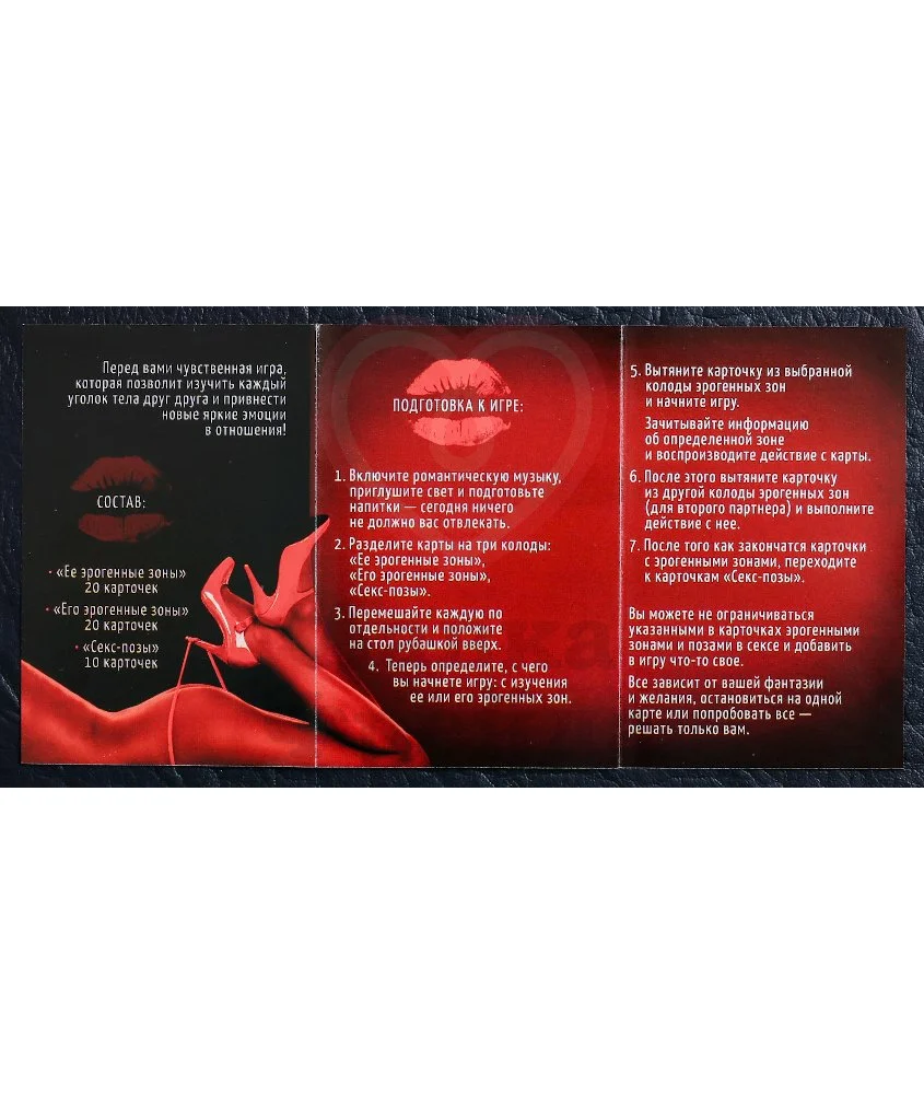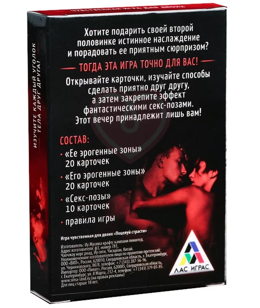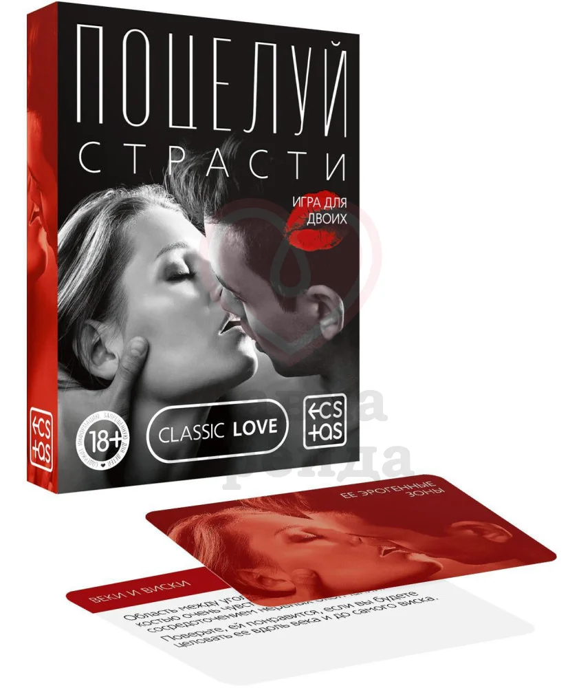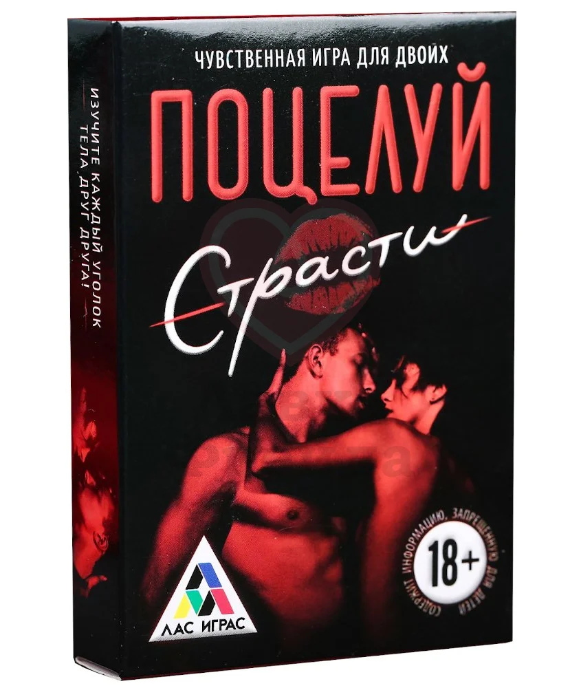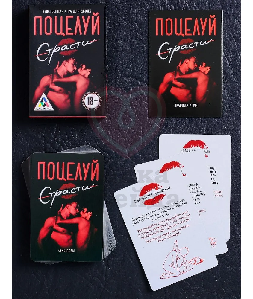 Игра «Поцелуй страсти» придумана, чтобы раскрыть ваши самые чувственные стороны и чтобы оба партнёра получили свою порцию удовольствия. В комплекте две колоды по 20 карт, которые подскажут вам места на теле партнёра, которым стоит уделить особое внимание. Первый игрок тянет карту из своей колоды и выполняет её указания: в заданиях рассказано о популярных эрогенных зонах и прикосновениях, которые могут понравиться вам и вашему любимому человеку. Затем второй игрок повторяет то же самое со своей картой. А вот после того, как вы почувствуете себя достаточно разыгравшимися, можно перейти к третьей колоде из 10 вариантов секс-поз с инструкциями и рекомендациями по применению. Таким образом, вы сможете провести не один приятный вечер в компании своего парнёра.