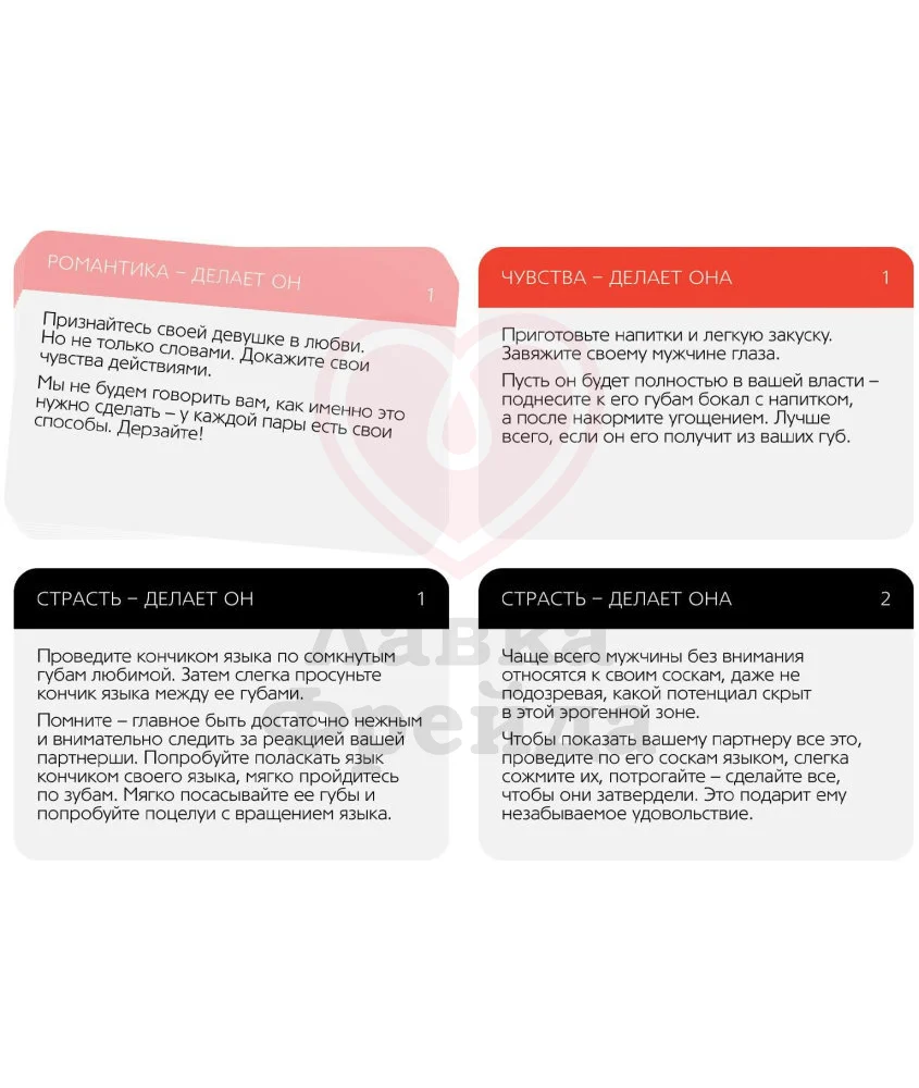 На одной стороне карточки указаны действия для девушки, а на другой — для мужчины. Ознакомьтесь с информацией на обеих сторонах выбранной карты и дерзайте.