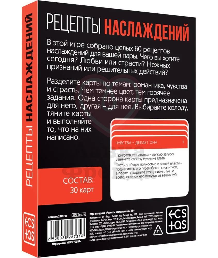 Возбуждающая игра для влюблённой пары. В этой игре собрано целых 60 рецептов наслаждения для вашей пары. Чего вы хотите сегодня? Нежности или страсти? Романтических признаний или решительных действий? Выбирайте, колоду какого цвета вы будете использовать, и познайте новые вершины удовольствия.