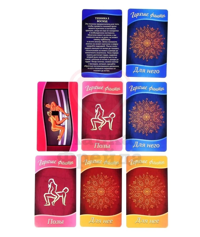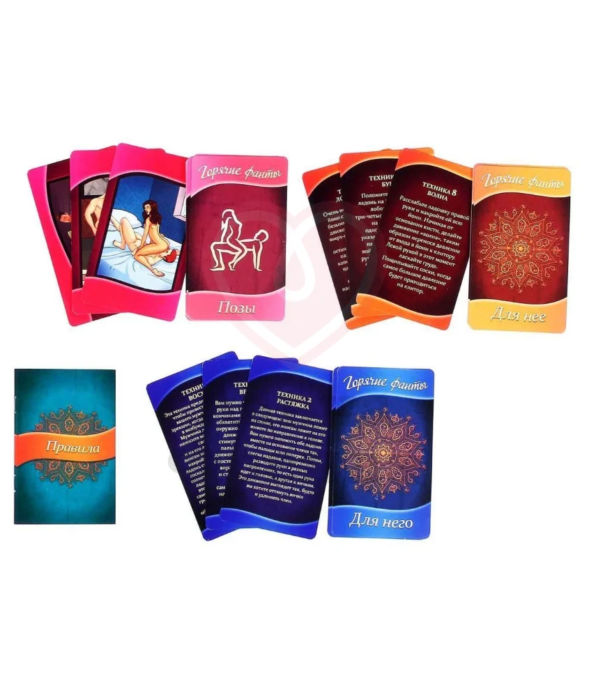 С помощью игры вы сможете узнать много новых техник доставления удовольствия. Например, интимный массаж и особые прикосновения к эрогенным зонам. В комплект входит 40 карт, 10 из которых предназначены для него, а 10 – для нее. Остальные фанты содержат описание самых сладких поз.