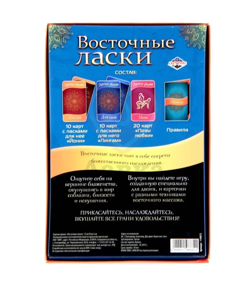 Игра «Восточные ласки» приглашает в бесконечный мир сладостного наслаждения, словно арабские сладости или загадочные любовные учения. Настоящие блаженства, ранее недоступные никому, в одной коробке: в каждом фанте сокрыты истинные секреты эротического восточного массажа.