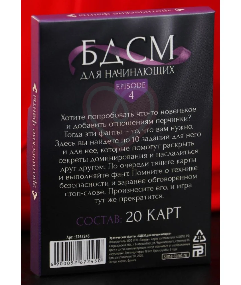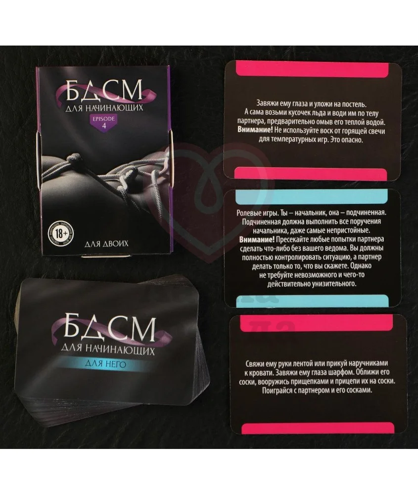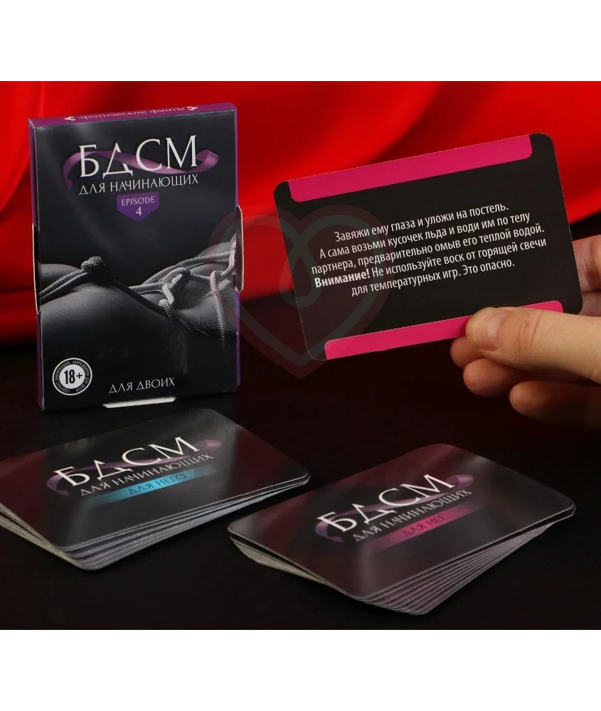 Фанты «БДСМ для начинающих» помогут вам попробовать новые секс-практики или ролевые сценарии. В наборе находятся 10 карточек с заданиями для неё и 10 — для него. Для выполнения фант иногда потребуются специальные атрибуты: наручники, бондажные ленты, зажимы или кляп. Игры в стиле БДСМ добавят привычным отношениям немного перчинки, новых ощущений и освежат впечатления от секса. Идеально для тех, кто хочет изучить свои желания или предложить партнеру кое-что необычное. Тяните фанты по очереди и исполняйте их, чтобы приятно провести вечер. В наборе: 20 карточек с фантами